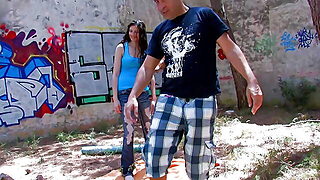 Busty dark-haired German babe Tania Berry gets pounded hard outdoors
