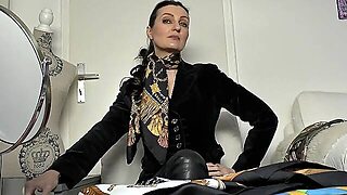 Brunette femdom whipping tied up slave and queening him