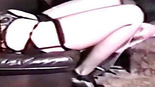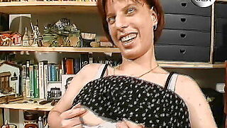Redhead Milf masturbates big dildo in vintage lingerie nylon